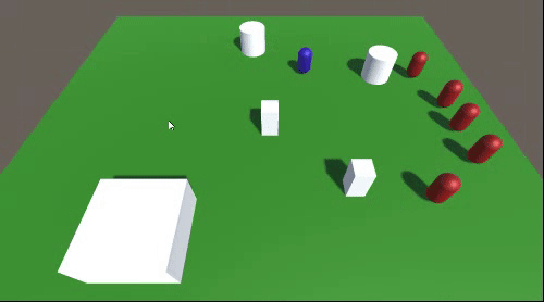 The first thing to do is create a simple scene along with a player and an enemy. I’ve just added a plane and some cube and cylinder based obstacles. Then created a capsule for the player and one for the enemy.